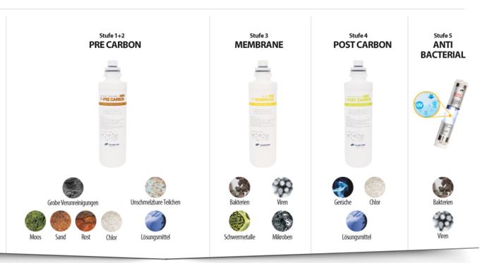 Wasser filtern - und zwar richtig. Wir setzen auf Umkehrosmose als Filtrationsverfahren! Die Umkehrosmose ist das wohl sicherste anwendbare Verfahren überhaupt. Die Filtration erlaubt es nur H2O- Molekülen, sowie wenigen gelösten Ionen die Membrane zu passieren. Wusstet Ihr, dass ein menschliches Haar 900.000 Mal größer als die Pore einer Umkehrosmosemembrane ist?